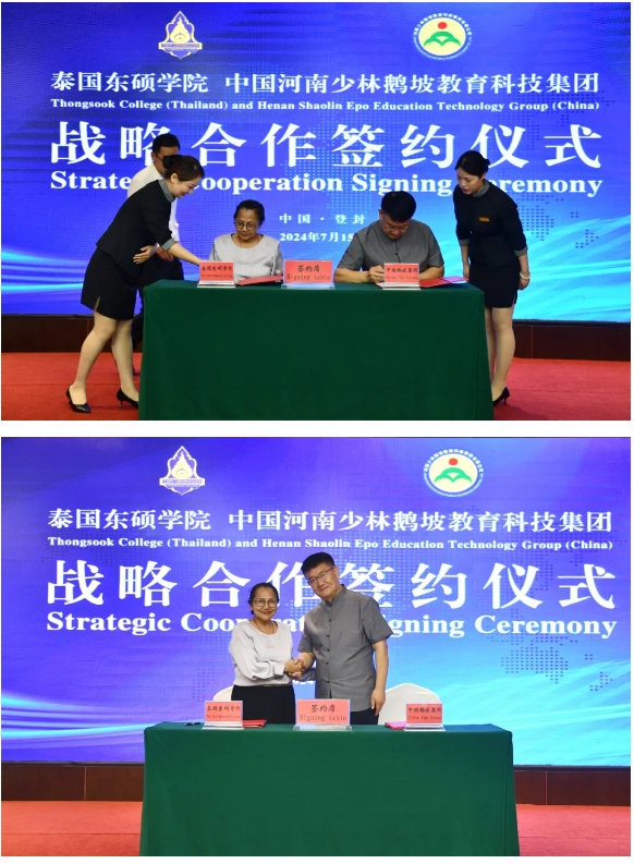 7月15日上午,泰國曼谷東碩學院與河南少林鵝坡教育科技集團戰(zhàn)略合作協議簽訂儀式在禪武大酒店會議室舉行。泰國曼谷東碩學院校長容慧、國際部主任那春秋、國際部副主任孫慶超,鄭州凰品文化傳播有限公司董事長高志鋼、總經理張穎,鵝坡集團董事長梁少宗、副總經理田文奇等領導出席了本次活動。