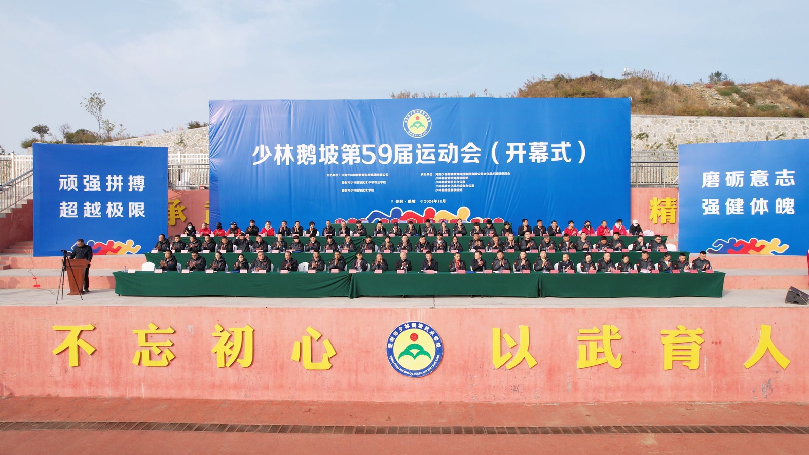 11月1日上午,少林鵝坡第59屆運(yùn)動(dòng)會(huì)在鵝坡武校體育場(chǎng)盛大開幕。鵝坡武校校長(zhǎng)梁少宗,國(guó)家武術(shù)套路隊(duì)教練、鵝坡武校特聘武術(shù)專家聶建國(guó)等領(lǐng)導(dǎo),以及本屆運(yùn)動(dòng)會(huì)的裁判員,鵝坡武校特聘教練,河南少林鵝坡教育集團(tuán)、鵝坡中專、鵝坡武校的有關(guān)負(fù)責(zé)人和全體師生齊聚一堂,共同見(jiàn)證這一激動(dòng)人心的時(shí)刻。開幕式由鵝坡武校書記常福曉主持。