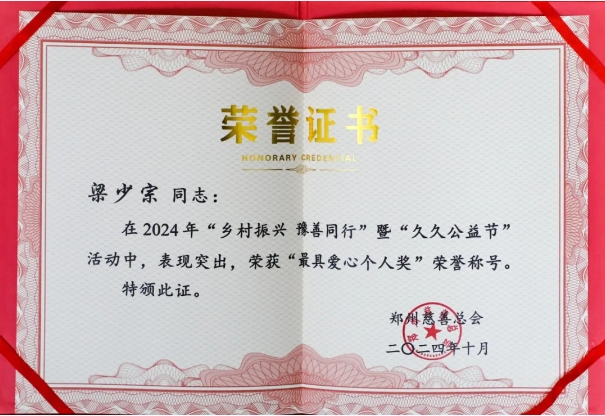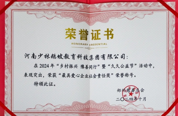 近日,河南少林鵝坡教育集團憑借在2024年“鄉村振興 豫善同行”暨“久久公益節”活動中的突出貢獻,榮獲“最具愛心企業社會責任獎”,河南少林鵝坡教育集團董事長梁少宗榮獲“最具愛心個人獎”。