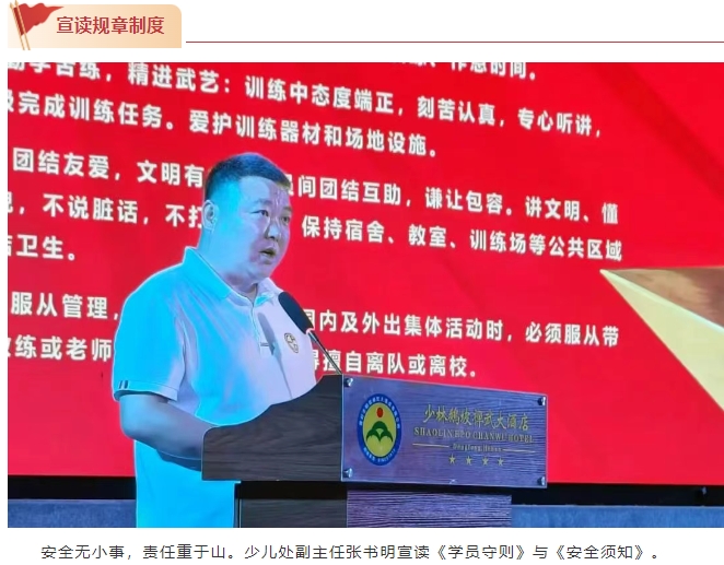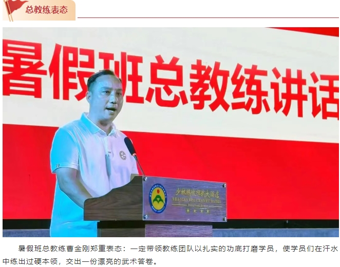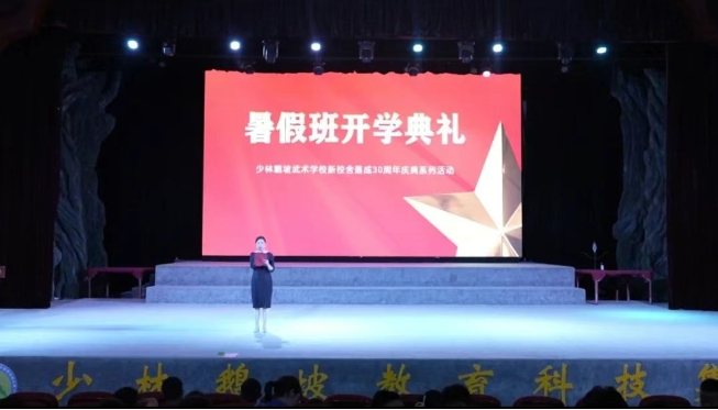 副校長(zhǎng)周洪多致開(kāi)場(chǎng)辭。他首先代表學(xué)校向每一位暑假班學(xué)員表示熱烈的歡迎,向辛勤付出的全體教職員工致以誠(chéng)摯的問(wèn)候!他特別指出,鵝坡武校作為當(dāng)代武術(shù)教育的重要基地和武術(shù)人才的培養(yǎng)搖籃,多年來(lái),為社會(huì)輸送了一批批優(yōu)秀人才,他們?cè)谖湫g(shù)競(jìng)技、文化傳承、教育教學(xué)等各個(gè)領(lǐng)域發(fā)光發(fā)熱,取得了優(yōu)異的成績(jī)。學(xué)員們選擇在暑假走進(jìn)鵝坡武校,是對(duì)武術(shù)的熱愛(ài),對(duì)成長(zhǎng)的渴望,更是對(duì)鵝坡武校的信任。學(xué)校為學(xué)員們準(zhǔn)備了一支專(zhuān)業(yè)的教練團(tuán)隊(duì)和優(yōu)秀的文化課教師,希望學(xué)員們?cè)谟?xùn)練期間堅(jiān)定信念,勤奮學(xué)習(xí),刻苦訓(xùn)練,學(xué)有所成。