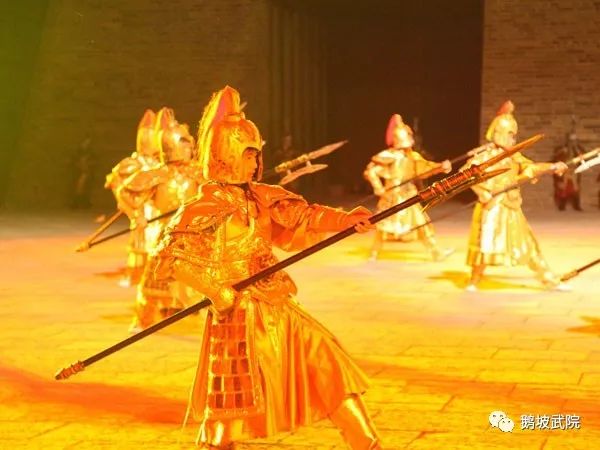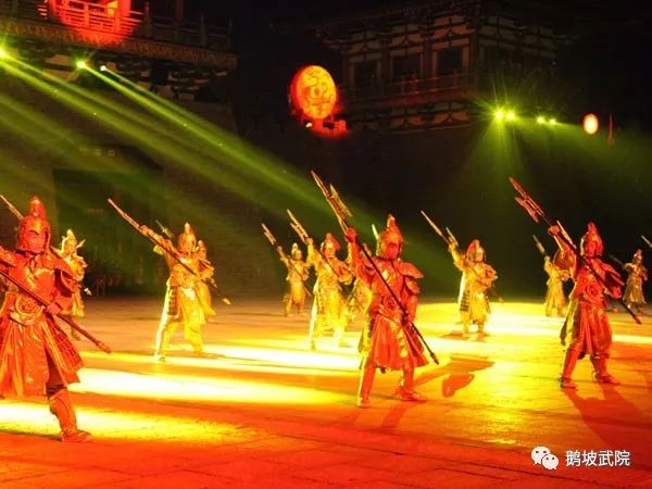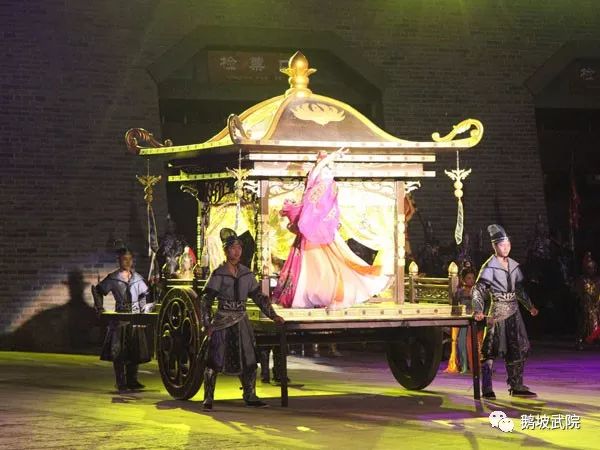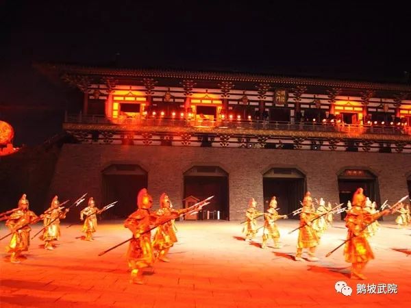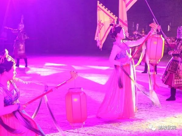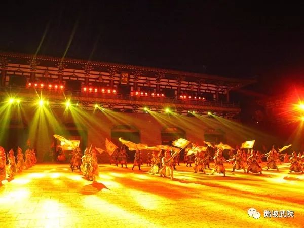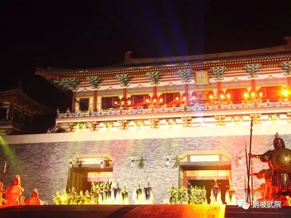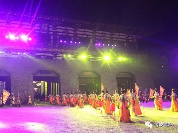 明德門、朱雀門演出是《大唐倚夢》前后壓軸戲,也是鵝坡弟子的重要表演地。7月14日夜晚正式演出時,鵝坡武院總教練梁少飛帶領鵝坡有關領導專程前往湖北襄陽,先后在明德門、朱雀門觀看助陣演出,并慰問師生。