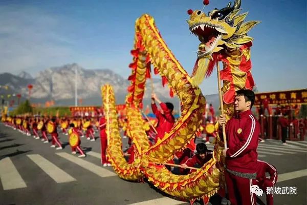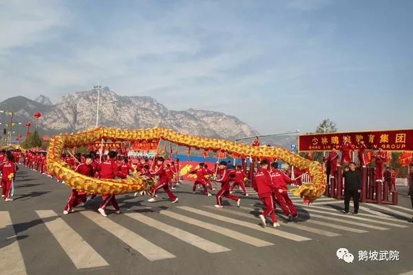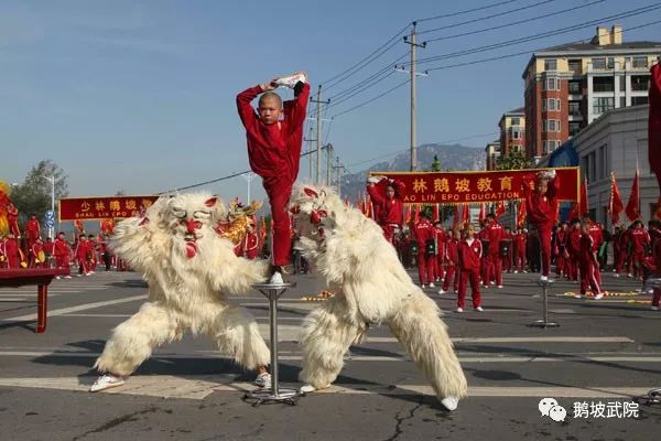 在少林路與禪武大道交叉口處,鵝坡弟子表演區,龍獅威武、空中飛舞,百名弟子盾刀威風,情定梅花樁,體現了少林功夫的神奇絕妙和博大精深。