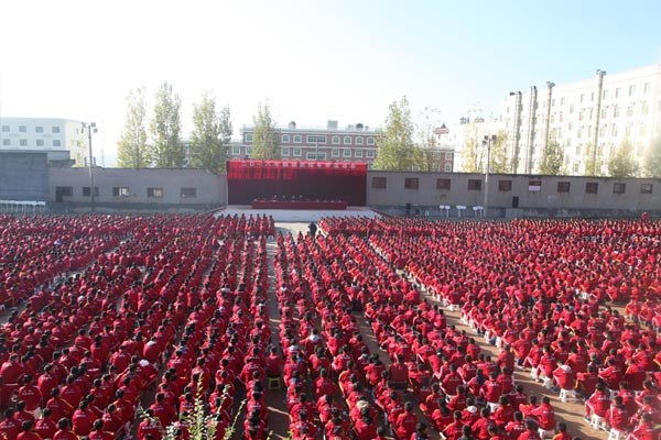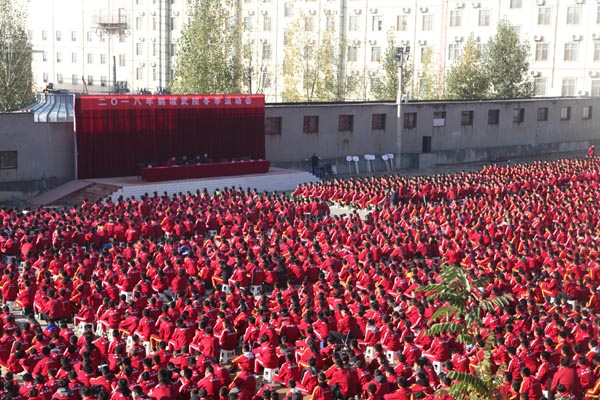 創辦人健步登上主席臺,向萬名學子揮手致意。校委會全體領導并排在主席臺站定,與師生們同聲高唱“鵝坡武院之歌”,共同歡呼又一次舉辦盛大的運動會。