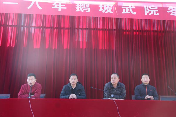 開幕式大典結束后,常務副院長常福曉、院長助理梁洪勛、武教處主任梁洪亮、團支部書記張瑞光就運動會的注意事項以及大賽期間的后勤保障工作做了具體部署和詳細安排。常福曉強調指出,校運會期間更要加強校園紀律的監督執行,切實維持校運會的組織秩序,使本屆校運會在安全穩定下順利展開。梁洪亮在布置校運會賽事工作時重申,要培養學生的賽臺禮儀觀念,提高武術人的文明水平,要求參賽隊員給裁判、教練、對手以及對方教練行禮。