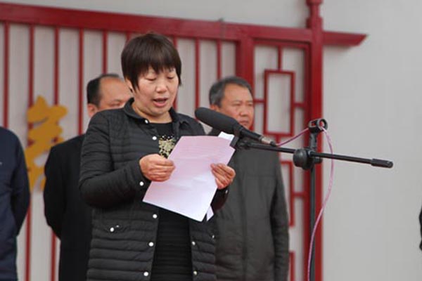 趙溝村黨支部書記康素娟在講話中深情地回顧了鵝坡教育集團創辦人查驗文化廣場和村衛生所的感人情景。她說,鵝坡教育集團的幫扶大恩,趙溝村世代銘記。同時,康素娟還講述了鵝坡教育集團副董事長梁少飛親臨趙溝村督查扶貧工程建設的故事,也介紹了鵝坡武院常務副院長常福曉帶領師生節日期間給村民送溫暖、幫助村民治理村容村貌的動人場面。