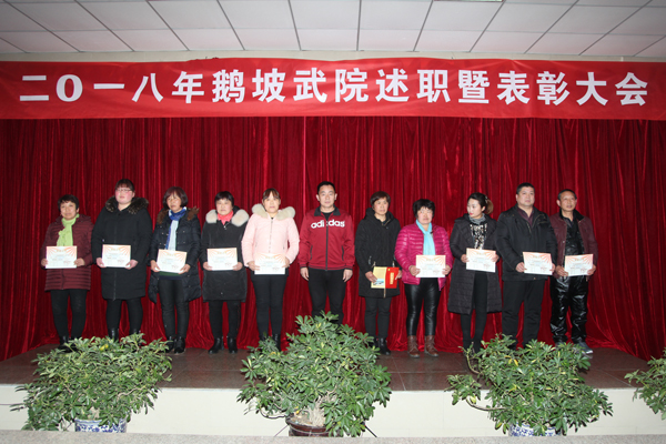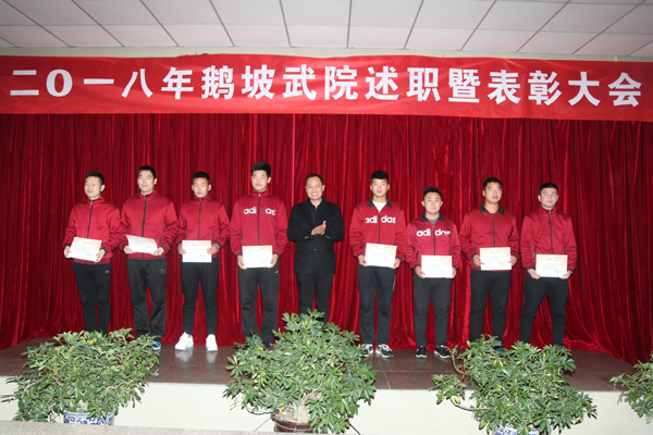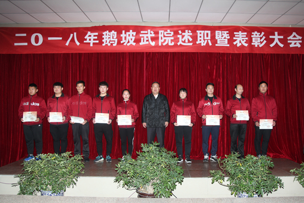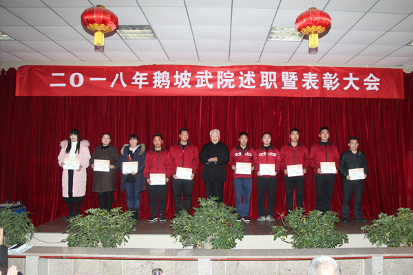 2018年,鵝坡武院全體教職員工胸懷全局,立足本職,開拓進取,甘于奉獻,為提升學院教育教學質量做出了積極的貢獻,涌現出了一大批愛崗敬業、成績顯著的優秀同志。會上,分別對特等先進工作者、先進工作者、安全穩定獎獲得者及文化教學先進班級進行了表彰獎勵。