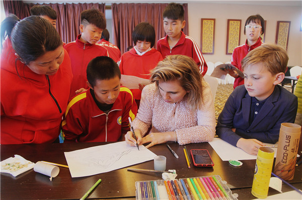 在授課中,岡特先生以童話故事的方式繪聲繪色地講述了大自然中各類奇妙現象與生態環境的關系,幫助學生們用更廣闊的視角看待和理解生態環境問題。凱瑟琳娜女士和師生們分享了自己的創作思想和理念,用她獨到的環保見解和“靈感”在學生們心中播種下綠色生態的種子,使學生在聆聽中,在創作中,得到深刻的啟示和幫助。