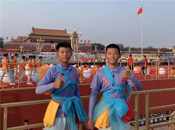 10月1日晚上,國慶節(jié)北京天安門廣場大聯(lián)歡的舞臺上,有一對雙胞胎兄弟閃亮登場、綻放精彩。他們是鵝坡武校的高三年級學(xué)生孫凱光、孫凱星。
