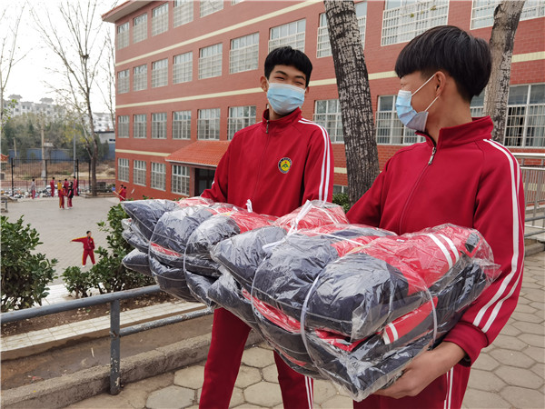 發(fā)放保暖衣物。鵝坡武校根據(jù)學(xué)生身體狀況,量身發(fā)放棉衣。學(xué)生穿在身上,暖在心里。