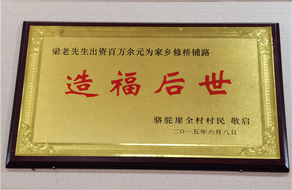 這些年,梁以全先生先后捐款三百多萬元用于修建鄉(xiāng)村公路、文化建設(shè)、幫扶濟(jì)困等,為駱駝崖鄉(xiāng)村振興作出了突出貢獻(xiàn)。駱駝崖村支書說:“梁老這些年為家鄉(xiāng)做的太多了。他不僅出資為村里修水泥公路、建校舍、為村文化室購置書柜和圖書、建俱樂部并配備各種健身娛樂設(shè)施,讓鄉(xiāng)親們?cè)谵r(nóng)忙之余可以讀書、鍛煉,逢年過節(jié)不出村也可以看大戲;而且又重修了駱駝崖村抗日指揮部鳳冠寨,修建了梁氏拳坊。梁氏拳坊2018年被命名為“登封市青少年教育基地”。