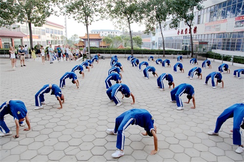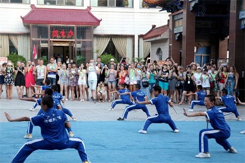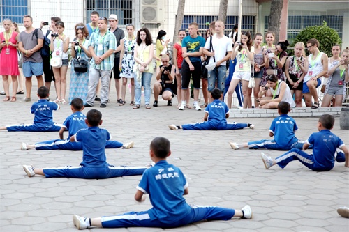 白俄羅斯參觀團來到校園時,已將近下午七點,黃昏時分。但校園內外依舊是一派熱氣騰騰的練武景象,校園外的梅花樁上十幾歲的學員們正手持少林棍,揮舞得風生水起。首先吸引外國朋友的是招生辦對面的空地上三四十個八九歲的小學員們,他們正把各自手中雙節棍揮舞得虎虎生風。進入校園的白俄羅斯朋友們急不可待地高高舉起照相機、手機紛紛拍照。在辦公樓前面的空地上,左邊是近百個小學員齊揮手中寶劍,寒光閃閃;右邊是年齡更小的三四歲的學員雙手合十,兩眼微閉,稚嫩的小臉寫滿嚴肅。再后面是面孔有些黝黑的學員們就地翻滾跳躍、剛勁有力地揮拳劈腿。接二連三的精彩場面,使白俄羅斯朋友們覺得眼不夠用,手不夠用,有些應接不暇。這邊還沒看夠,那邊導游催他們了,“快走,后面還有更精彩的! ”。