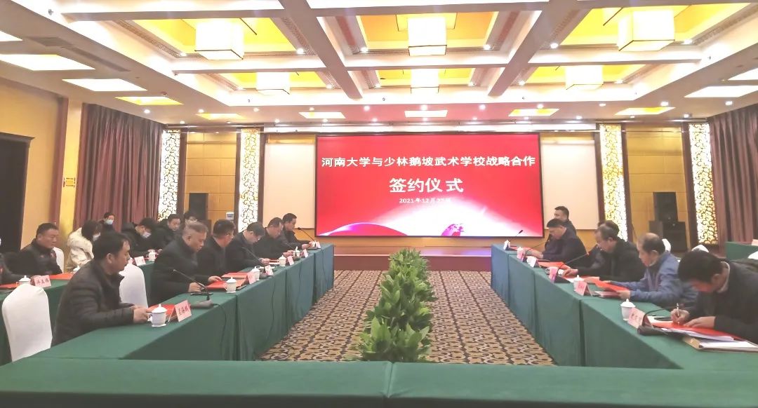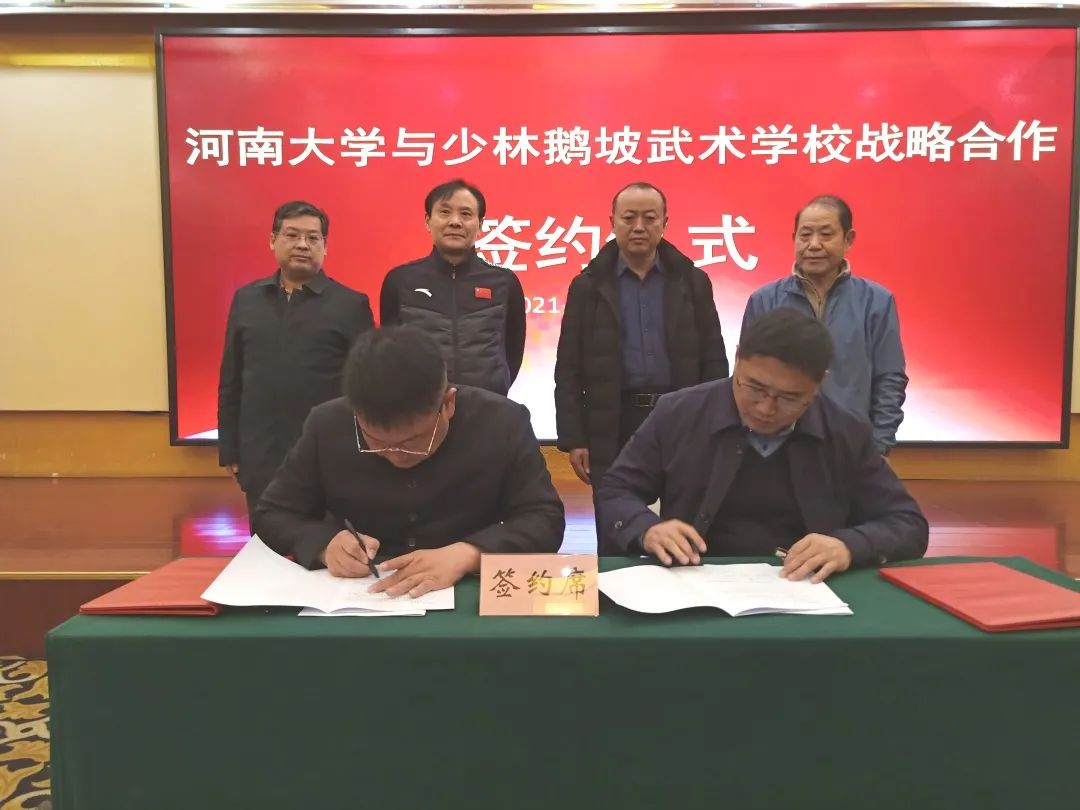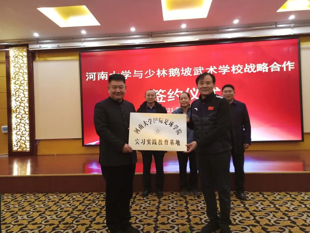 本著“長期合作、共同發展、優勢互補、互惠互利”原則,以實現雙方多層面的可持續發展為目標,建立起靈活高效的合作機制,形成長期緊密的合作關系。12月27日,河南大學體育學院與登封市少林鵝坡武術學校戰略合作簽約儀式在禪武大酒店會議室舉行。河南省青少年校園足球工作領導小組辦公室常務副主任、河南大學國際足球學院院長郭蔚蔚教授,河南大學體育學院黨委書記段廷良,河南大學體育學院院長、博士生導師張大超教授等一行領導,登封市教育局局長董輝,河南少林鵝坡教育科技集團董事長、總校長、鵝坡武校校長梁少宗,鵝坡武校領導班子成員及相關處室主任出席了活動,簽約儀式由鵝坡武校黨總支書記、常務副校長常福曉主持。