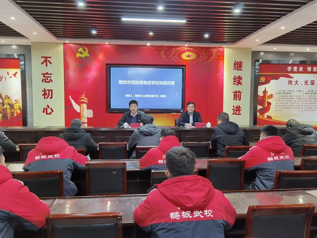 為加強我市青少年思想道德建設,把立德樹人根本任務落到實處,根據市委市政府安排,開展登封市黨政領導進校園講思政課活動。12月29日下午,登封市副市長王麟樂同志走進鵝坡武校黨建室,為鵝坡師生們帶來了一堂別開生面的思政課。本次講座由登封市教育局黨組書記李智鑫主持。