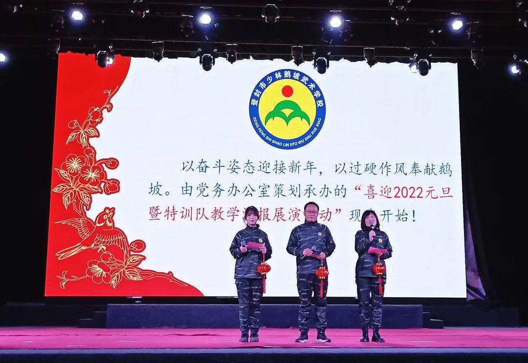 12月31日上午9:00在禪武大酒店展武堂,舉辦“喜迎2022元旦暨特訓隊教學匯報展演活動”,活動由鵝坡武校黨務辦公室策劃承辦。特訓隊員以展演的形式匯報教學訓練成果,回顧學習成長歷程,開啟明年奮斗新篇。