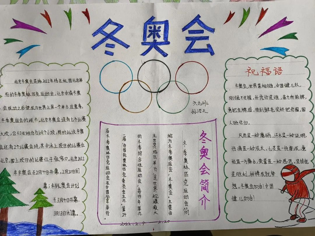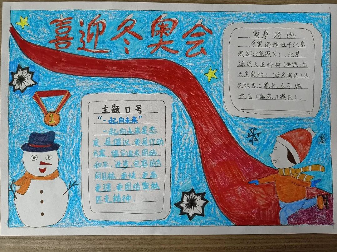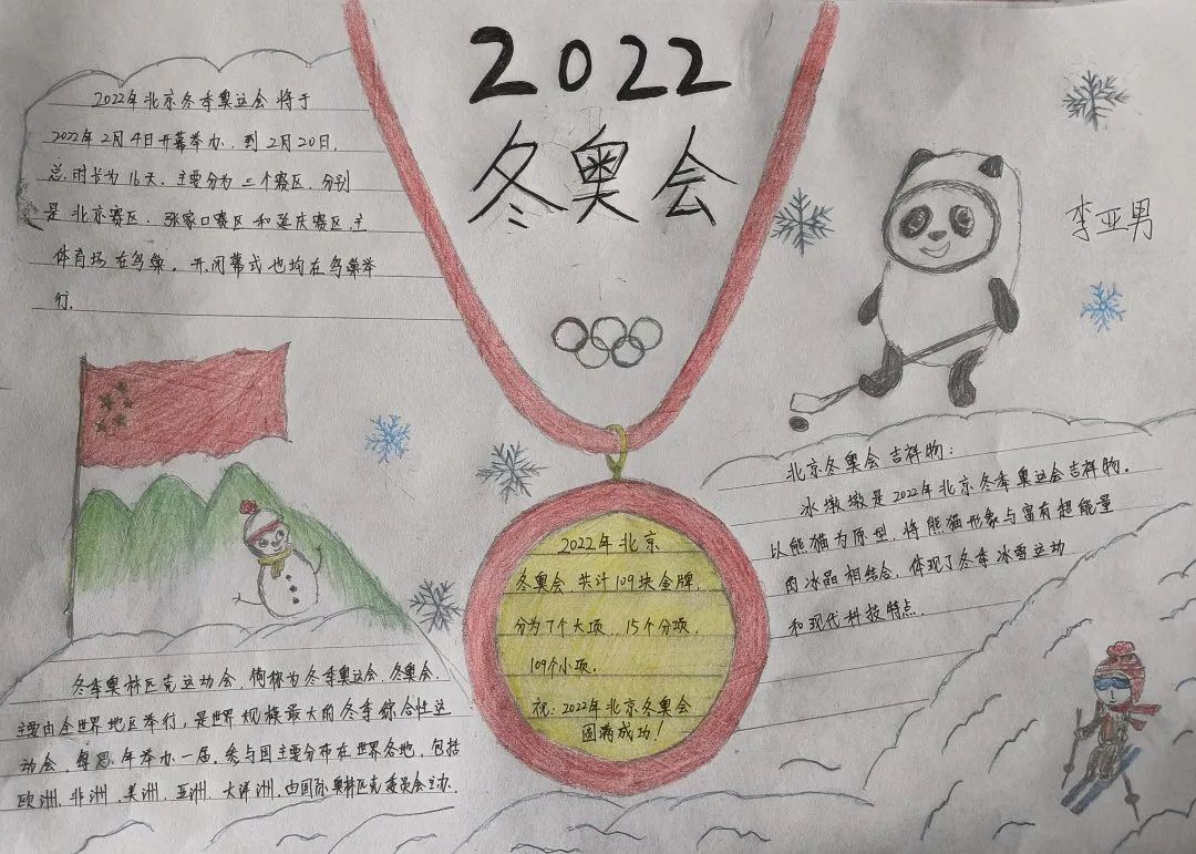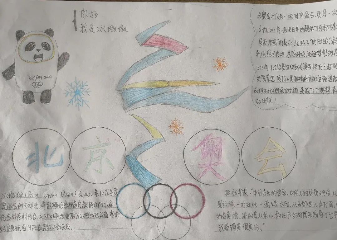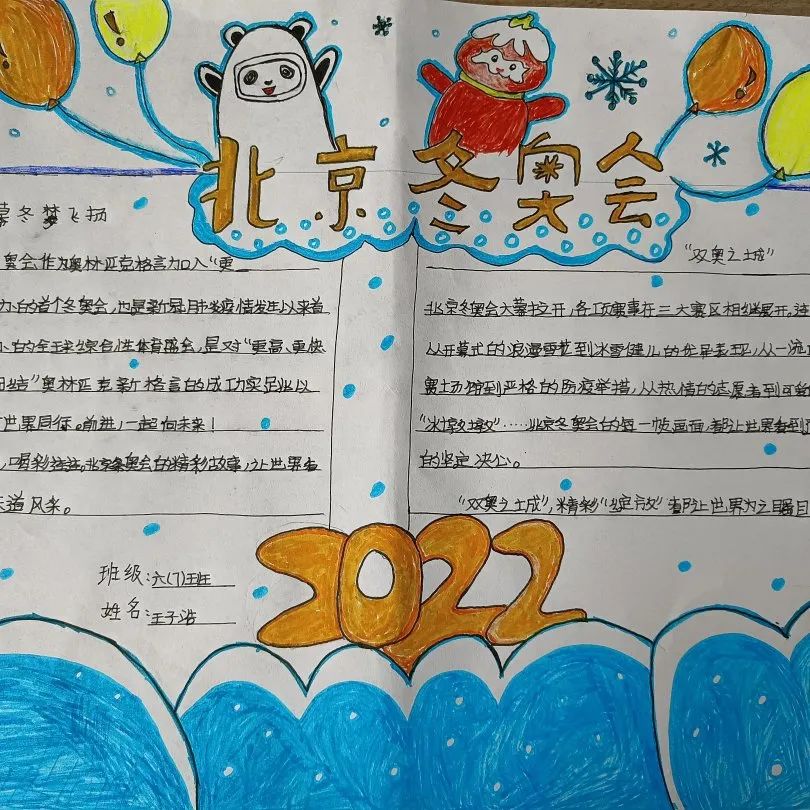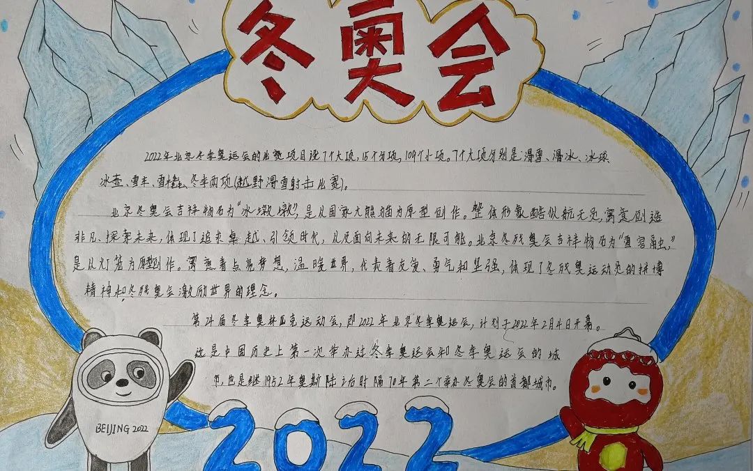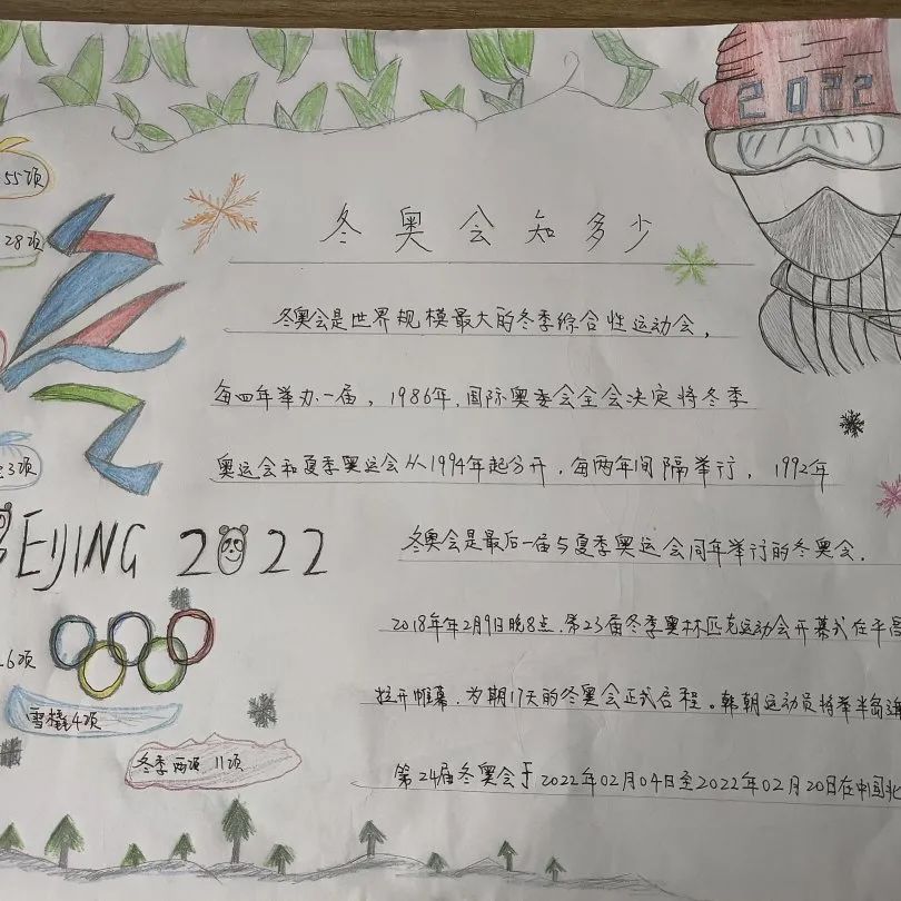 同學(xué)們精心準(zhǔn)備,踴躍參與。通過豐富的想象,用手里的畫筆繪出自己心中的冬奧會(huì)。手抄報(bào)精美細(xì)致,內(nèi)容豐富,拼搏的奧運(yùn)健兒,軟萌可愛的“冰墩墩”和“雪容融”......一勾一畫,一字一句,充分展現(xiàn)了鵝坡學(xué)子的冬奧情懷。