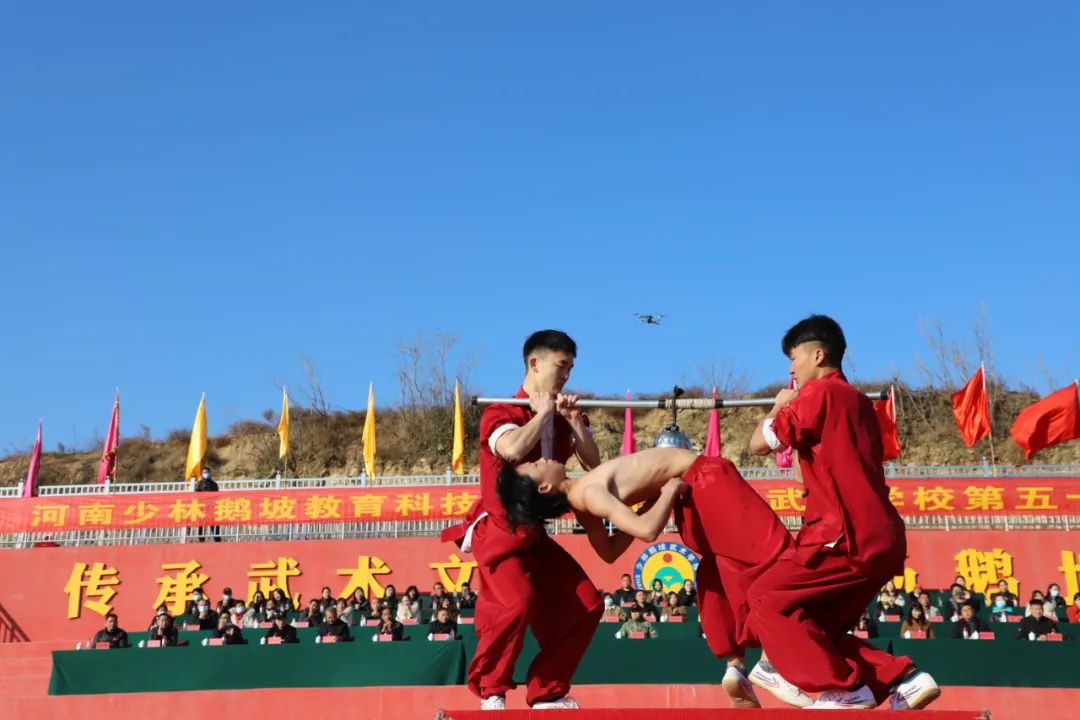 鵝坡武校創辦于1977年,是經教育體育部門批準,集文化教學、武術訓練、體育競賽、影視表演于一體的現代綜合性武術學校,學校歷年榮獲“中國十大武術名校”、“國家青少年武術俱樂部”、“青少年教育基地”、“河南省武術訓練基地”、“河南省十佳館校”、“鄭州市文明學校”、“登封市五佳館校”,并被河南省體育局、河南省武術協會授予河南省武術工作“突出貢獻獎”。2019年,學校被國家體育總局和北京體育大學確定為國家雙球青少年(足球、冰球)青訓人才培養基地。