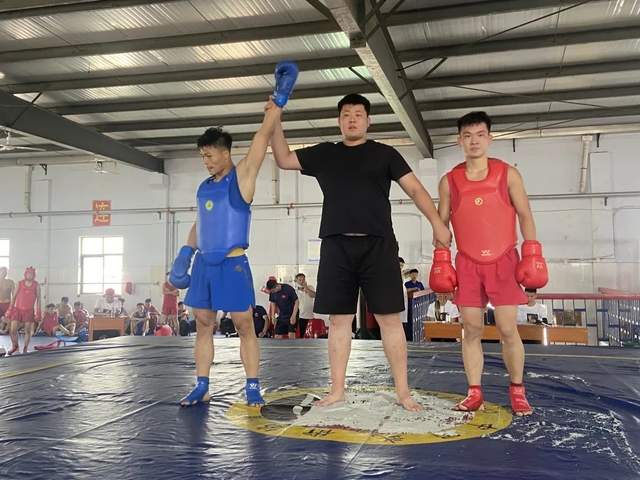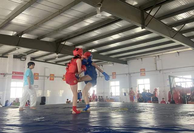 緊接著我們看散打項目。散打學員上場前都要認真的整理護具、活動熱身。雙方隊員就位后,互相施禮,小小的一個抱拳正是仁義武德的彰顯。在散打賽場上,運動員們雙手握拳,雙方忽左忽右,時進時退,一招一式充滿青春張力,一拆一擋彰顯健兒風采。