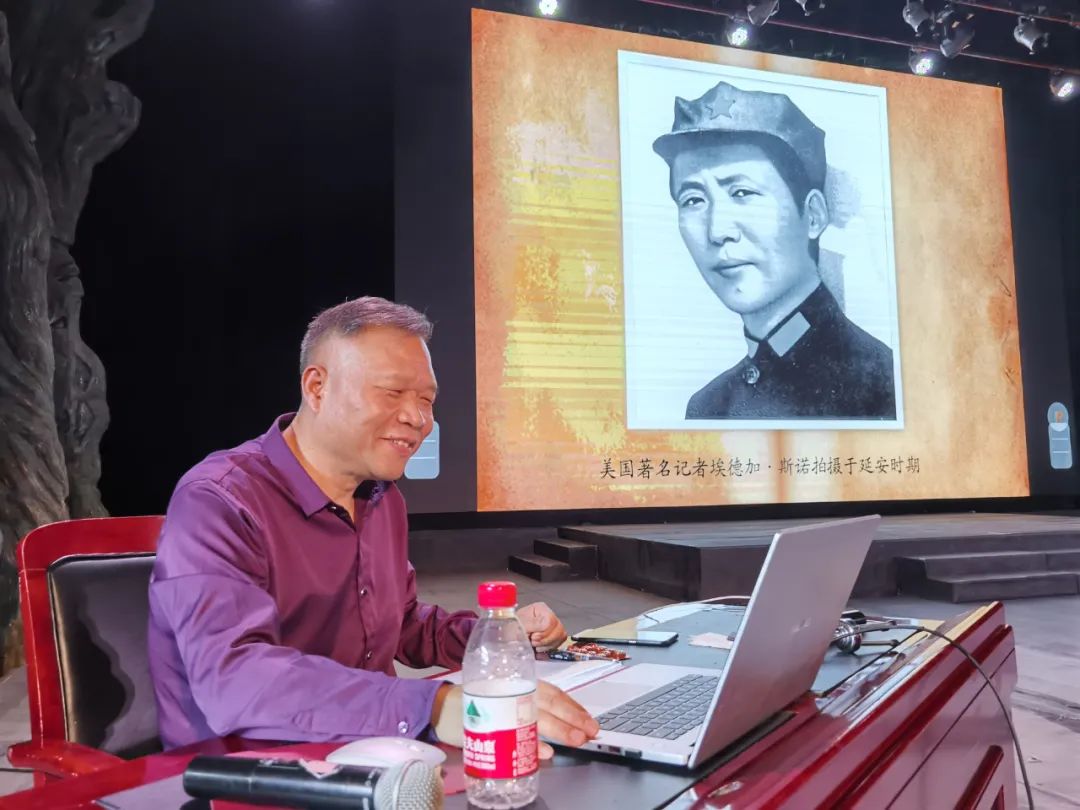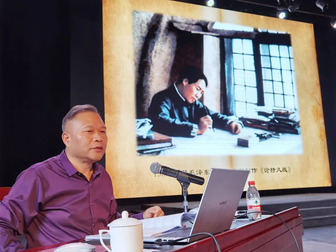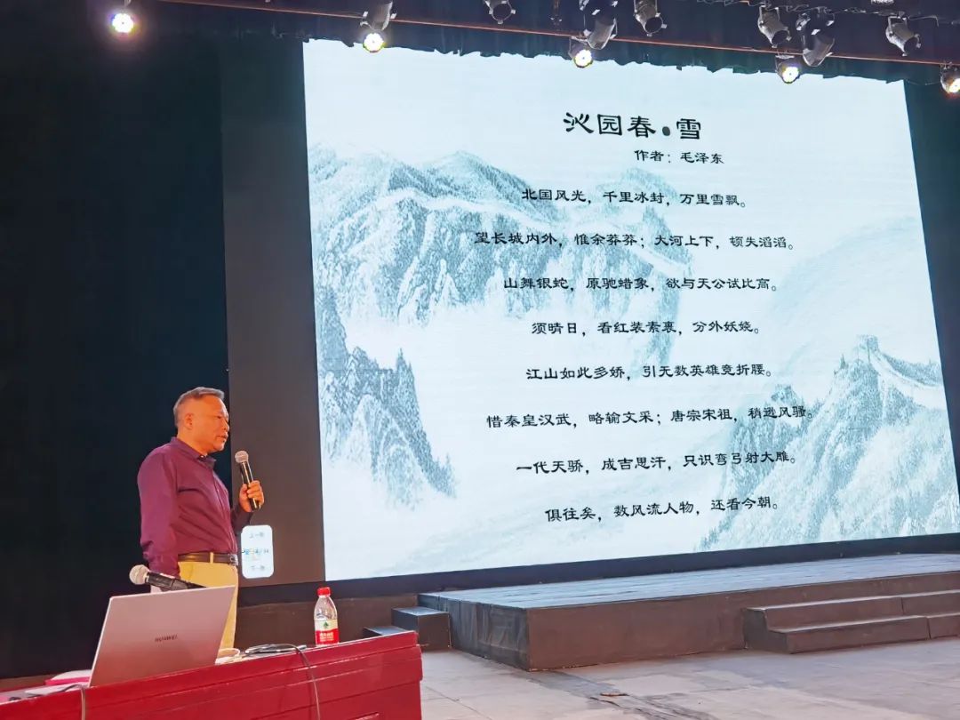 最后,李主任現(xiàn)場朗誦了毛澤東的《沁園春·雪》,他激情澎湃,氣勢(shì)軒昂,用鏗鏘有力的聲音將情感和朗誦完美結(jié)合,感染了在場的每一個(gè)人,臺(tái)下掌聲不斷。時(shí)光穿越,為民族抗?fàn)幍牡豆鈩τ霸缫涯蹋澘淘跉v史年輪上的鏗鏘聲音卻猶在晨鐘暮鼓,歷歷在耳。